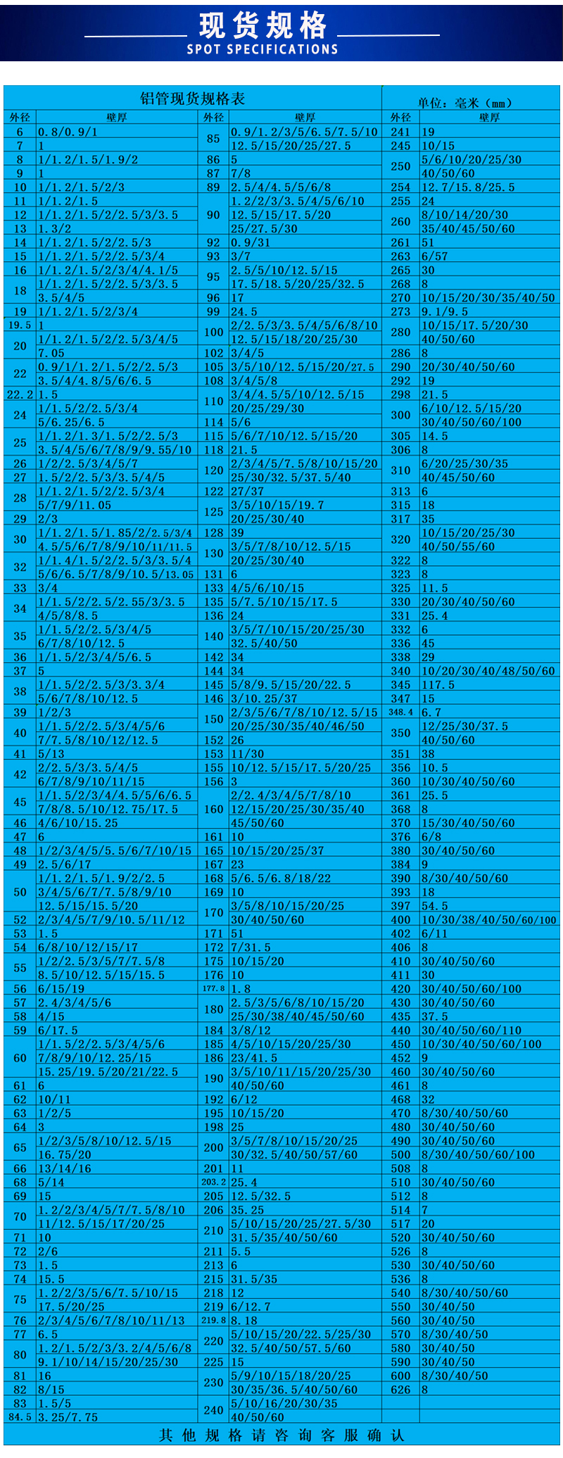 聚金鑫(上海)鋁業有限公司主要經營無縫鋁管,鍛造鋁管,擠壓鋁管,鋁合金棒,鋁方棒,鋁排 5754鋁管_5182鋁管_鍛造鋁圓片_鍛造鋁管_6082鋁管_7075鋁棒 鋁管  鋁方管 無縫鋁管 厚壁鋁管 鋁板 鋁卷 鋁棒 鋁排 角鋁 鋁型材等有色金屬,所售產品均執行鋁材行業標準,有鋁型材擠壓生產線5條,噴涂、氧化生產線3條,配有CNC加工中心,以品質保障、現貨規格多樣、效率高來滿足不同客戶需求,所售鋁型材主要應用于零部件制造業、工程、煤礦、電力、汽車工業、建筑裝飾、能源化工、船舶制造業、機械工程、儀器設備、航空航天等行業。公司始終堅持為客戶提供品質保障的鋁材作為企業發展的根本,并為客戶提供系統的鋁材產品解決方案,以周到細致的服務回報廣大客戶.       主營產品材質有:6063(T6普遍的合金材質應用廣泛) 6061(T4硬鋁管) 2A12(LY12多為無縫鋁管) 3A21(防銹硬鋁) 6005(厚壁鋁管) 7075(t5 T6航空鋁管) 5052(5056 5083海洋用鋁管) 1060(1050 1100純鋁管 多為鑄鋁管)     有縫鋁管規格 直徑4mm-506mm 壁厚0.7mm-50mm(材質基本為6063 6061 6005焊接性能好,硬度一般,應用多。     鍛打鋁管規格 直徑8mm-260mm 壁厚1mm-25mm(材質全部為2024 也習慣稱之為LY12 或者2A12 硬度高 制作工藝為硬鋁棒穿孔)     防銹鋁管規格 直徑10mm-300mm 壁厚1mm-30mm(5系鋁管 有縫,多數用于輪船,游輪,汽艇上)7075現貨 直徑16mm-185mm 壁厚2mm-16mm(7075材質多數為飛行器使用、其特點 密度低 質量輕,硬度高于普通合金1.5-2倍!但是其價格也比同等規格的鋁管高了接近120%,所以價格決定了7075的鋁管多數用在較為貴、精密的設備上面)